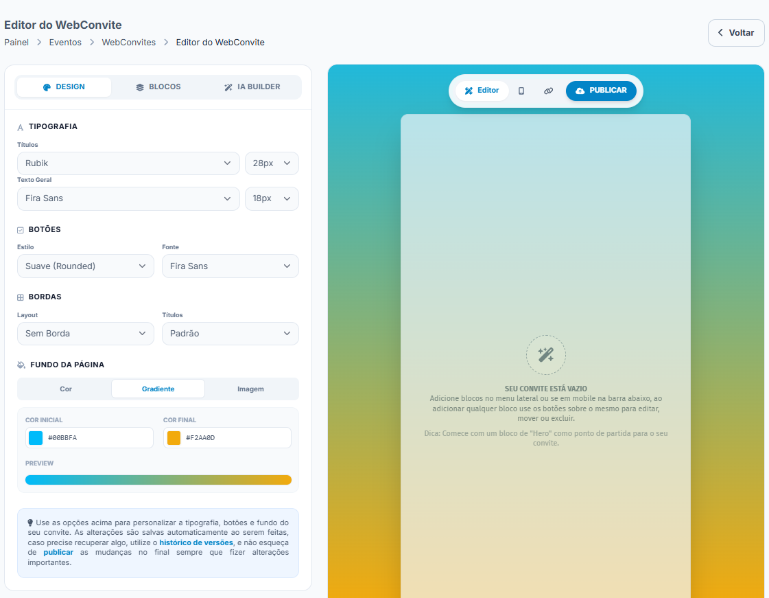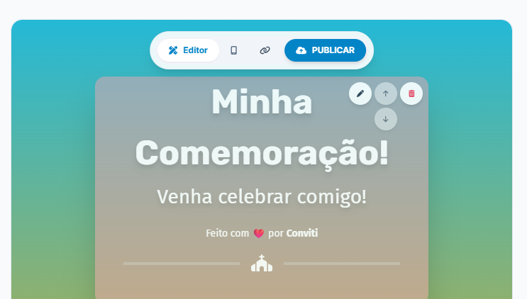 Lado direito: visualização do seu convite em tempo real e publicação