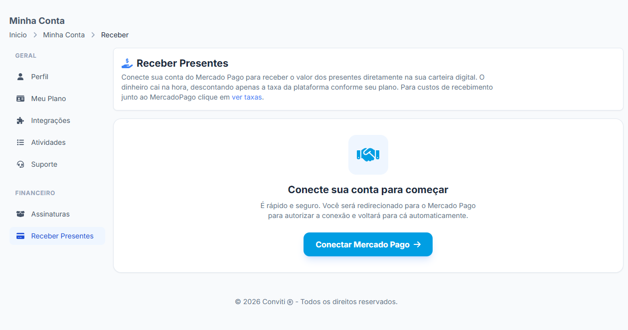 A conexão é necessária para que você possa receber valores de presentes diretamente na sua conta MercadoPago.